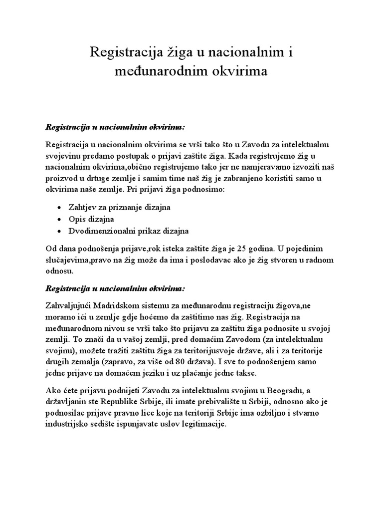 Registracija Ziga U Nacionalnim I MeÄunarodnim Okvirima from imgv2-2-f.scribdassets.com Tako, primera radi, žig, odnosno pravo iz prijave mogu se preneti na drugo lice ugovorom. Registracija žiga vezana je za postupak zaštite žiga. Preporuča se odabir isključivo proizvoda ili usluga unutar razreda za koje se žig koristi ili namjerava koristiti.