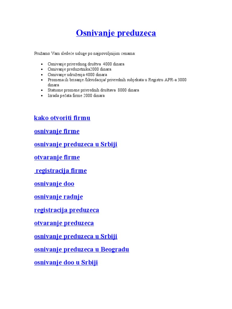 Registracija Firme. Агенција за привредне регистре обавештава прaвнa лицa и прeдузeтнике који примењују закон о рачуноводству, а још увек нису саставила и доставила своје редовне годишње финансијске извештаје. Osnivanje preduzeća u srbiji i registracija firme u apr je prvi i najvažniji korak ukoliko ste odlučili da pokrenete sopstveni biznis.