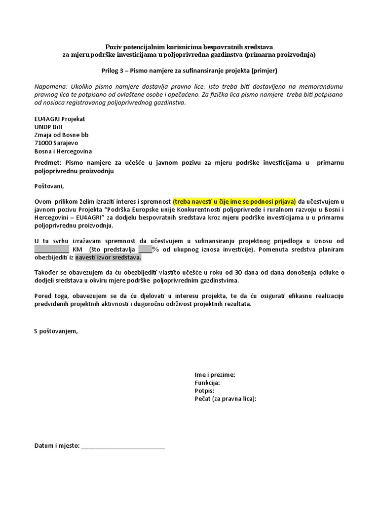 Eu4agri Prilog 3 Pismo Namjere Za Sufinanciranje Projekta Primarna Proizvodnja Pdf