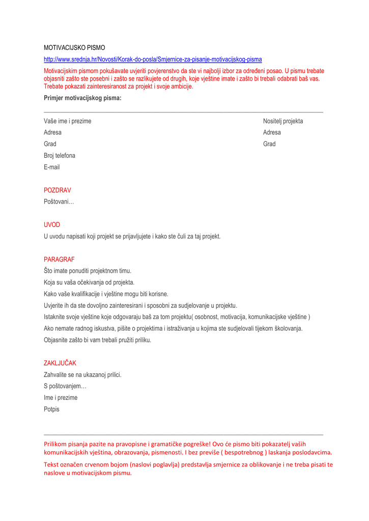 Motivacijsko Pismo Http Www Srednja Hr Novosti Korak