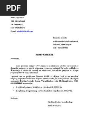 Pismo Namjere Tandem Bicikli Donacija U Robi I Uslugama Pdf