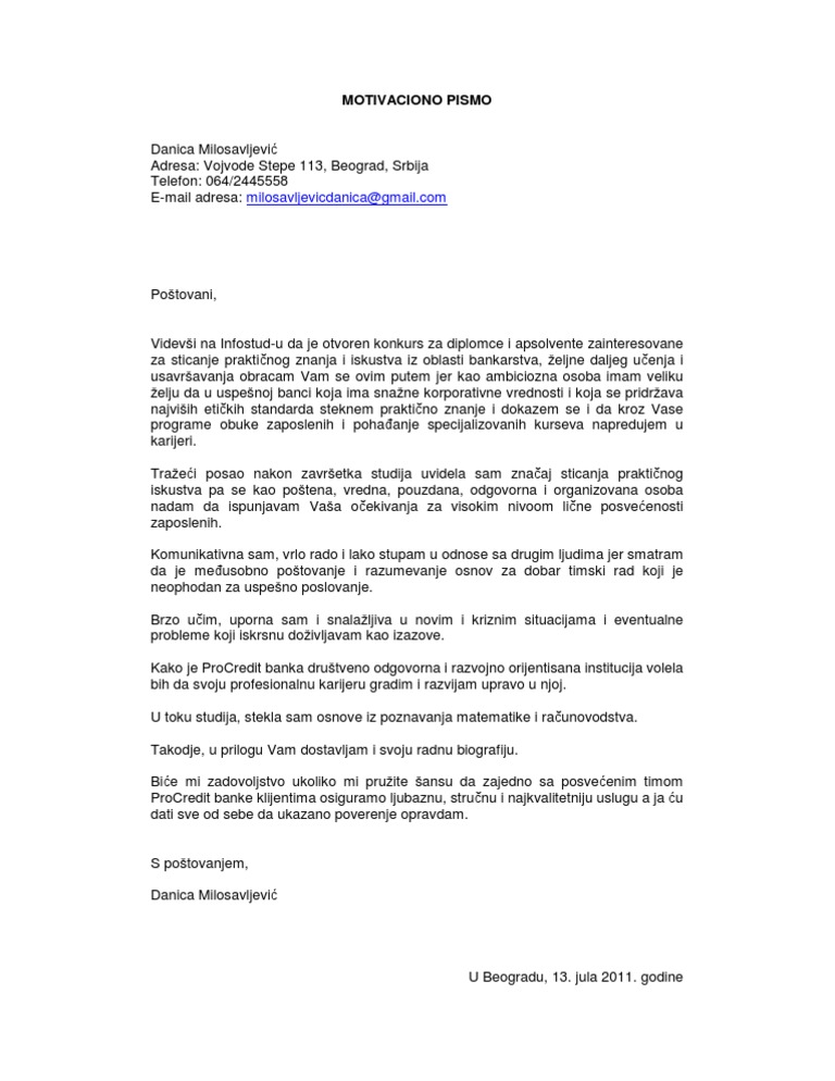 Letter of Motivation tjCover letter se često smatraju istim dokumentom a odnose se na pismo koje prati neki drugi dokument u ovom slučaju biografiju koju šaljete potencijalnom poslodavcu. Ipak najveća zasluga pripada samo tebi i to je najveći uspeh. Molba motivacijsko pismo Uz životopis obično predajete i molbu ili motivacijsko pismo.