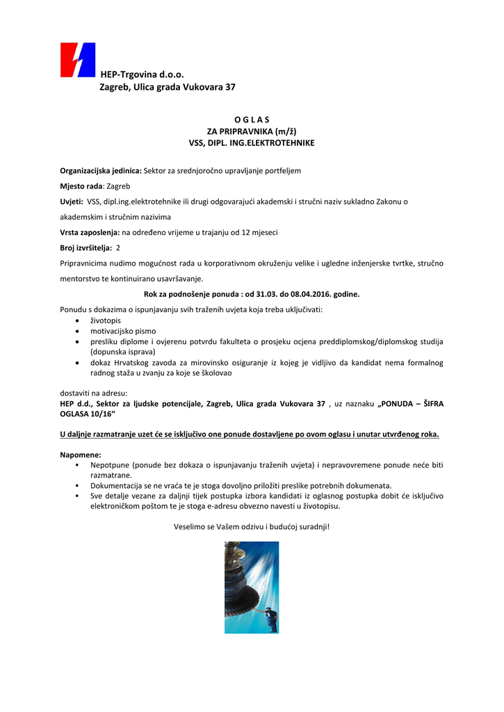 Oglas Za Pripravnika Vss Dipl Ing El Hep A