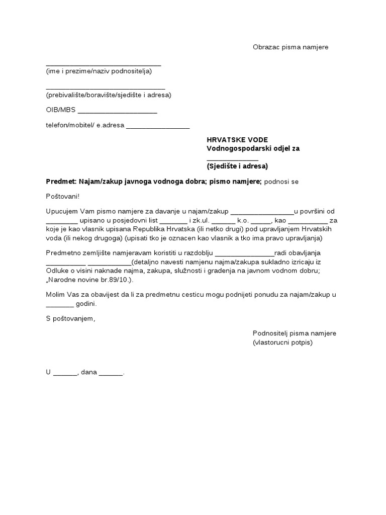 Pismo namjere forma. FPrimjerci ugovora iz poslovnih odnosa Članak 15. Kaže se pismo namjere. Ako itko zna i voljan je napisati primjer pisma namjere bila bih veoma zahvalna.