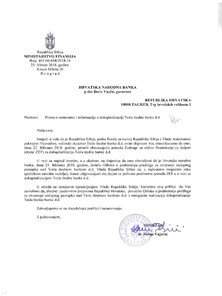 Pismo Ministarstva Finansija Rs Hnb U Tesla Stedna Banka Pdf