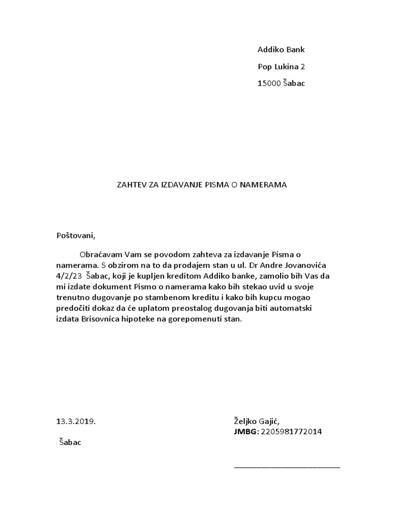 Pismo koje može biti. Pismo o namerama je instrument kojim Banka izjavljuje da će Klijentu odobriti neki od svojih proizvoda garanciju kredit i sl i preuzeti određeni budući rizik u poslovanju Klijenta obavezujuća pisma o namerama ili da će razmotriti mogućnost preuzimanja nekog budućeg rizika u poslovanju sa Klijentom neobavezujuća pisma o namerama. Apsolutno je moguće kupiti takav stan i izabrati banku koja nam najviše odgovara bez obzira kod koje je banke prvobitno upisana hipoteka.