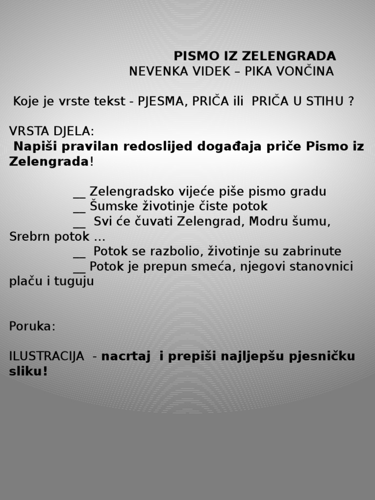 Ovaj tjedan trebali smo zajedno obraditi priču Pismo iz Zelengradaali zbog novonastale situacije zadane zadatke riješiti ćete kod kuće. 8971 rezultata za priča iz zelengrada Pismo iz Zelengrada- kviz Kviz. Iz brloga Ispod brijega Pospani se.