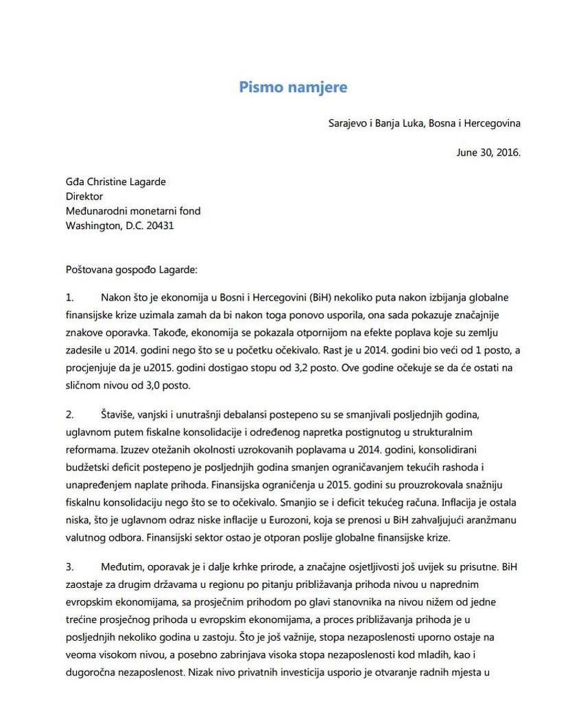 Vlada Federacije Bih Objavila Sadrzaj Pisma Namjere Mmf U