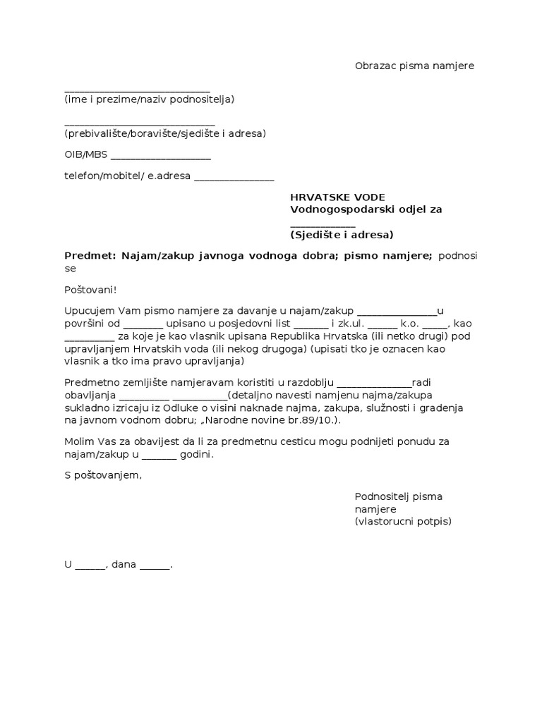 Pismo namjere može se upotrijebiti za dokumentiranje bilo čega za koje želite prijaviti namjeru. Godine se zaustavila a poslovna 2010. Ako pismo potpisuje jedna osoba onda potpis ide sa desne strane po pravilu od 45.